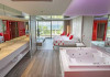 Dotari camere: Camerele hotelului dispun de: telefon, TV, minibar, maxibar (contra cost), seif, jacuzzi, baie cu aburi pentru 2 persoane, halat de baie si papuci (la cerere), birou, iluminare cu led-uri, internet wireless, balcon, facilitati pentru prepararea ceaiului si cafelei, aer conditionat.
