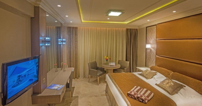 Facilitati hotel: restaurante si baruri, salon de infrumusetare, magazin de suveniruri, exchange, piscina exterioara sub forma de laguna, mini cascade, jacuzzi, piscina si teren de joaca pentru copii, baby sitting (contra cost), centru de sanatate si intretinere ce beneficiaza de echipamente complete si tehnologie de ultima ora- solar,fitness,sauna steam bath,teren de tenis, teren de squash,sala de jocuri-biliard,sala de conferinte. Tip masa:demipensiune, pensiune completa