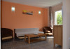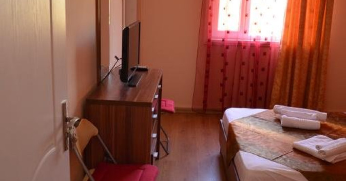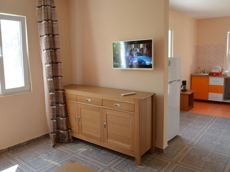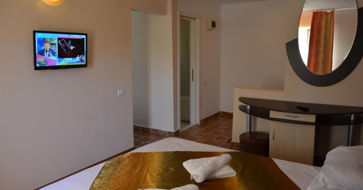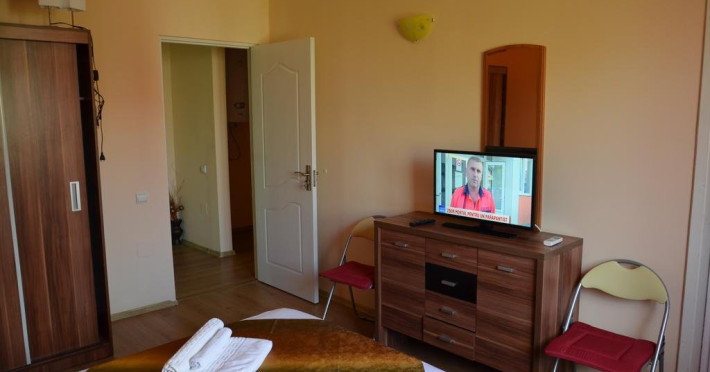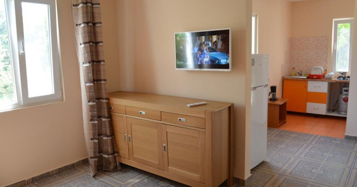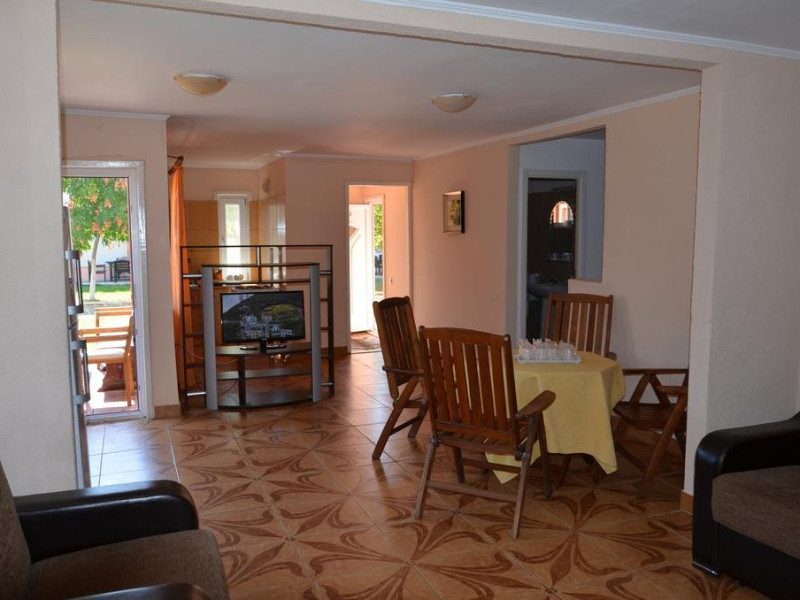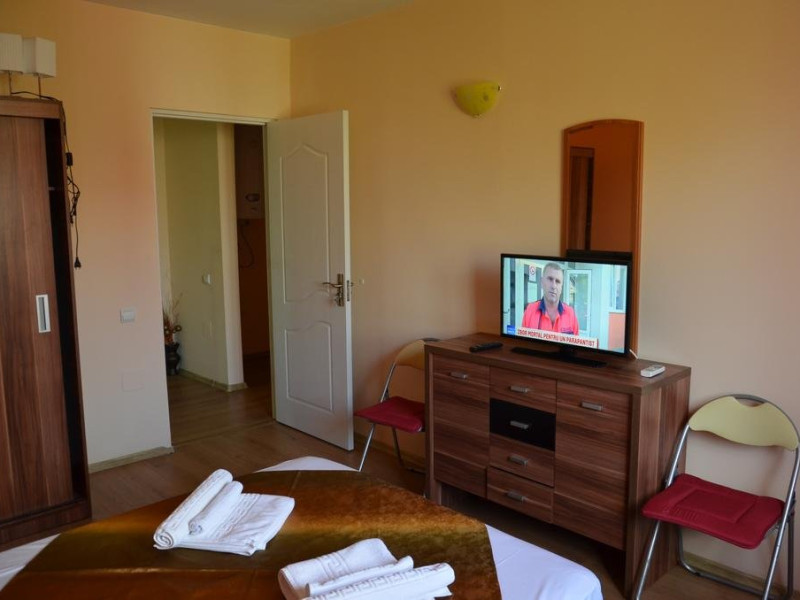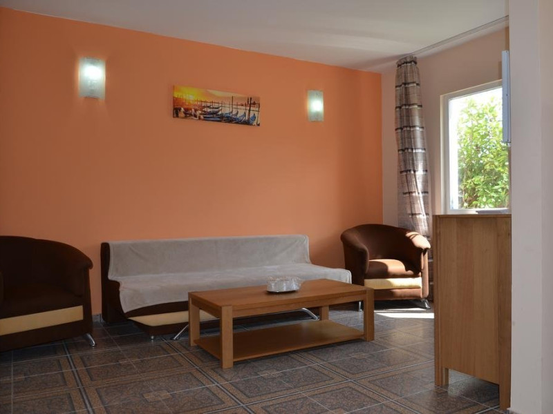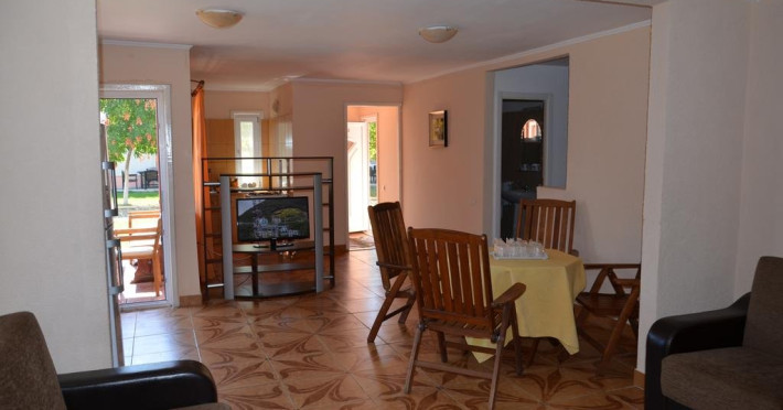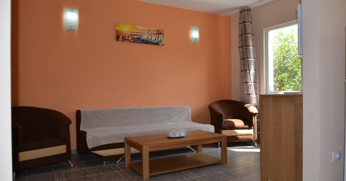 Apartament Familia Apartamentele tip Familia sunt apartamente duplex suprafata de 90 m.p. si se adreseaza familiilor cu mai multi membri sau chiar pentru 2 familii si copii care nu doresc sa acorde asa de mult timp bucatariei in concediu. - parter: living, chicineta dotata cu cuptor microunde , seturi complete de tacamuri, pahare, farfurii pentru 4-6 persoane, frigider,congelator, terasa cu mobilier de exterior si zona de servit masa, peluza proprie si gratar. La parter apartamentul dispune de o canapea extenibila in living si un grup sanitar. - etaj: doua dormitoare , fiecare cu aer conditionat si balcon si al doilea grup sanitar. Capacitatea minima este de 4 persoane adulte platitoare si maxima de 6 persoane.