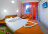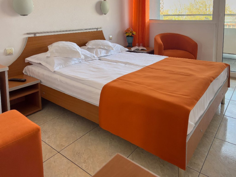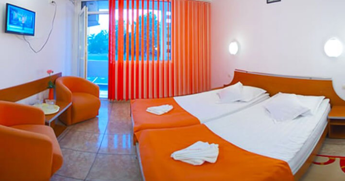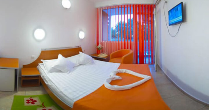 Dotari camere Camerele duble cu pat matrimonial (140x190 cm) sunt dotate cu aer conditionat, TV LCD, racit, grup sanitar, mobilier nou, usa cu acces pe baza de cartela, uscator de par, seif si telefon. In acest tip de camere se pot caza 2 adulti deoarece spatiul nu permite atasarea unui pat pliant. Demipensiunea camerei este de 14.3 mp. Camerele duble cu doua paturi (90x190 cm) sunt dotate cu aer conditionat, TV LCD, racit, grup sanitar, mobilier nou, usa cu acces pe baza de cartela, uscator de par, seif si telefon. In acest tip de camere se pot caza 2 adulti si 1 copil sau 2 adulti si 2 copii (pat pliant contra cost). Dimensiunea camerei este de 17.8 mp. Apartamentele sunt moderne si dotate cu un living cu canapea extensibila si dormitor cu pat matrimonial (180x190 cm), 2 TV LCD, aer conditionat, racitor, mobilier nou, doua grupuri sanitare, doua balcoane, usi noi cu acces pe baza de cartela, uscator de par, seif si telefon. In acest tip de camera se pot caza 2 adulti si 2 copii sau 3 adulti si 1 copil. Dimensiunea apartamentului este de 26.48 mp